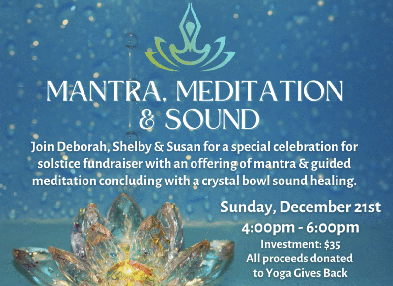 JOIN US FOR A SOLSTICE CELEBRATION & FUNDRAISER! Deborah, Shelby & Susan host this late afternoon event of mantra & guided meditation concluding with a crystal bowl sound healing.