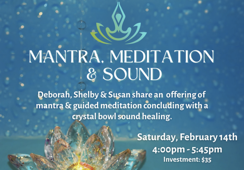 JOIN US FOR A CELEBRATION OF LOVE THIS VALENTINE’S DAY! Deborah, Shelby & Susan host this late afternoon event of mantra & guided meditation concluding with a crystal bowl sound healing.